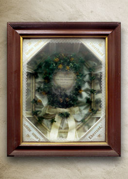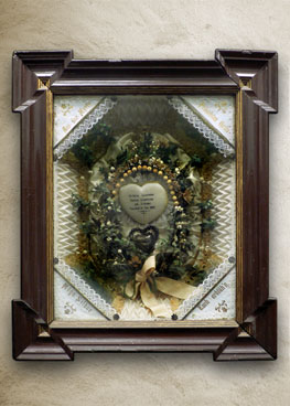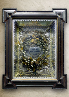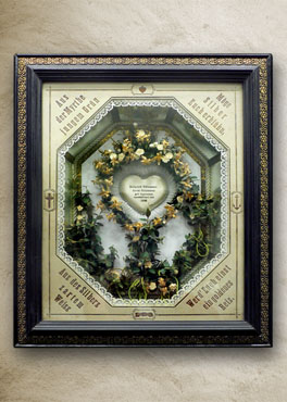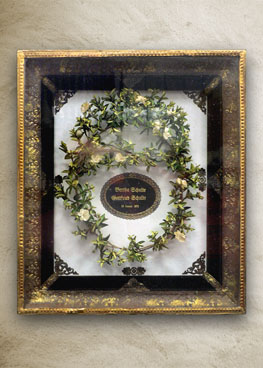 Diese dreidimensionalen, oft mit Spiegeln und Passepartout ausgestatteten und reichlich verzierten Rahmen enthielten den Brautkranz der Braut und das Anstecksträußchen des Bräutigams als "Brautkranzkasten" oder Gebinde aus Blumen und Haaren der Verstorbenen als Bildkästen zum Totengedenken.